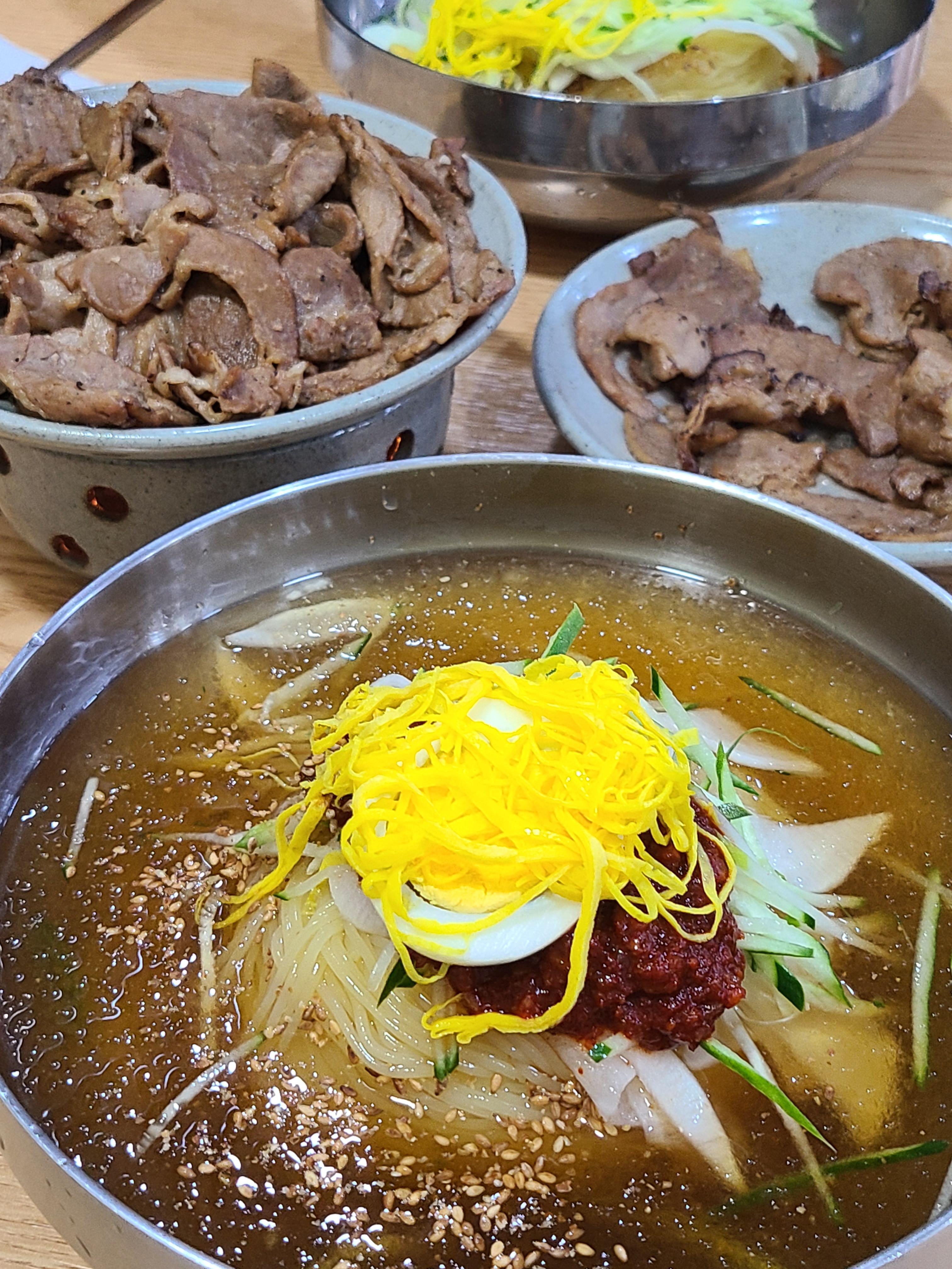 사진에는 없지만 밀면집에 항상 있는 그 뜨끈한 곰탕육수? 맛있어서 3잔 마셨습니다.면은 탱글 육수는 시원 고기는 불향이 조금 입혀져서 시-워언 하게 맛진 식사를 했습니다. 밀면 관심있으시면 추천스